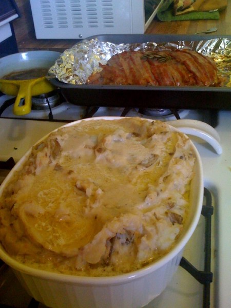 I made these garlic whipped potatoes with goat cheese. The chevre cheese gives it a unique flavor and tastes really good with the meatloaf. I added sauteed diced sweet onions for additional texture and flavor.