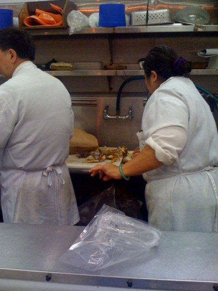 I like to have the butcher chop the crab up for me. I’m watching as the crab legs are still moving although the crab has been quartered. They rinse and bag the crabs.