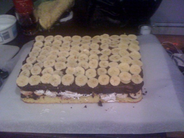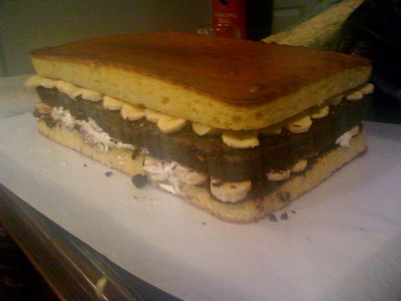 I started baking 3 cakes, two butter and one chocolate. All in long sheet cake tins. Added a layer of chocolate fudge pudding, layer of bananas.