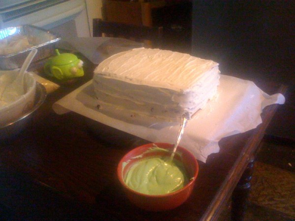 I made each cake in a longer metal reusable aluminum pan, so each layer was around 1 inch or so. Stacked them up, refrigerated them and went home for the night.