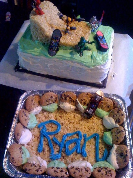 To make the ramp, I made a simple Rice Krispy recipe and formed the ramp within a deep plastic Gladware storage container. I used wax paper to push the cereal into the shape I needed and popped it in the freezer to form.