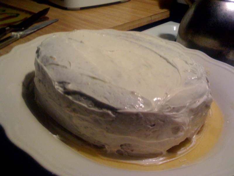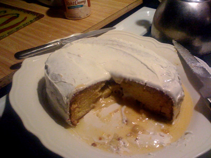 Wait until glaze soaks through and lightly ice cake with simple frosting.