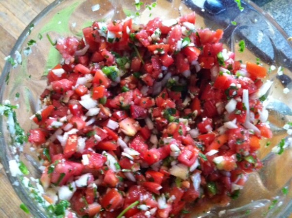 Directions: Simply enough – Dice all items in small pieces. A food processor can be used for the cilantro, jalapeno and garlic. Mix all ingredients. Best if chilled and refrigerated for a few hours before eating so that the items mix well.