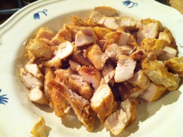 I like to marinate my chicken for a few minutes while getting the grill ready. I use a non-stick grill pan. I cut the breasts in large chunks to cook faster but not so small that they cook too fast and lose the tenderness. I try to cook one side so that the meat is cooked about half way through before flipping over. After the chicken is thoroughly cooked. I remove and chop up fajita style.