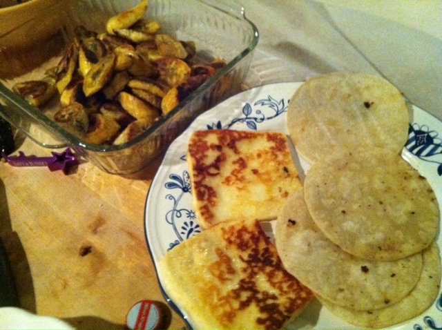 So far, I made the Pico De Gallo, Gallo Pinto, then stuffed them into peppers. I needed a few additions to this already yummy meal So I made Platanos Maduros, Grilled Chicken Breast and Fried Cheese with Tortillas. Here are those simple recipes.