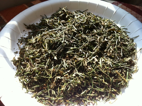 Dried the leaves for about two days in the sun, moving them to get coverage. Then I put the leaves in the food processor (or blender). I took them out and dried them on a page for another day and blended the herbs again.