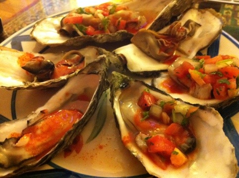 Pull back the shell and cut the oyster away from the shell. Leave oyster in half shell and add toppings. You can add champagne sauce, barbecue sauce, hot sauce or pico de gallo like pictured above.