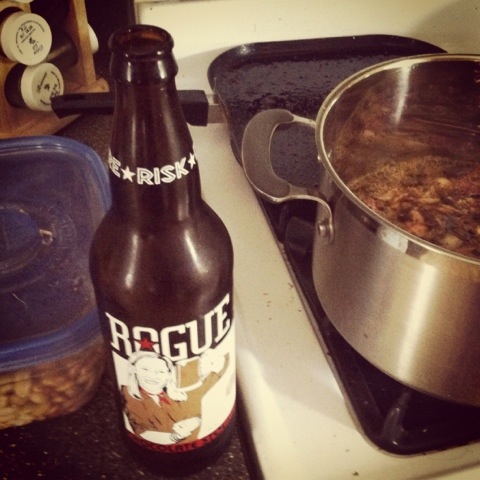 In a large pot, over Medium heat, add 2 tablespoons of olive oil, 2 teaspoons of minced garlic and 1/4 cup of minced onion and 1/2 tablespoon of Italian Herbs. Cook for about 3 minutes until soft and add about 12-16 ounces of the Rogue Chocolate Stout Beer to the pot. Mix throughly and add the beans. Cover with about 2-3 cups of water or until the beans are covered. Add tomato sauce.