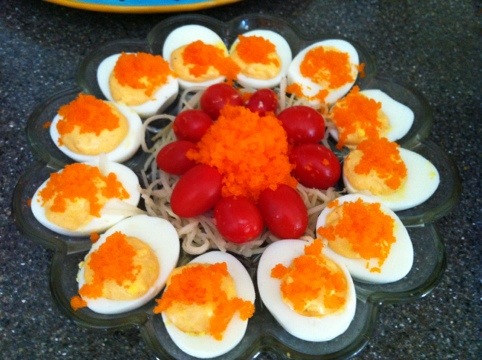 Boil six eggs, cool and deshell. Remove the yolks and place in a boil. Let cool. Add mayonnaise, sriracha and dash of salt. Fill egg halves with the egg mixture and top with a tiny dime size portion of tobiko.