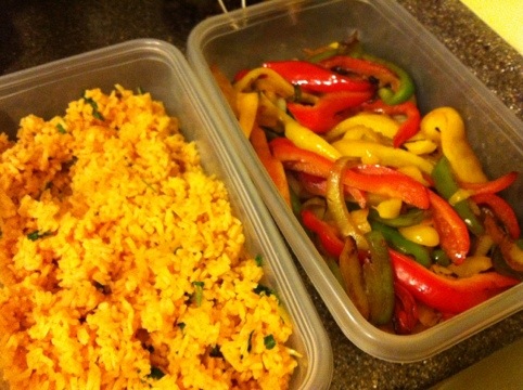 Below this is a type of Spanish Rice I make with a tomato sauce and cilantro. Next to it, very colorful bell peppers and onions. When I make these, I only lightly spray a pan cooking them on medium heat for about 5 minutes.
