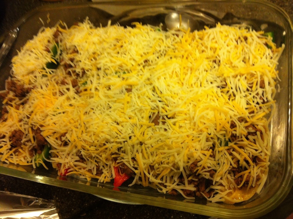 Cut the peppers lengthwise and remove seeds. Placed in oiled baking dish or tray. Pan cook ground beef with spices until done. Remove and full each bell pepper cup and top with shredded cheese. Cook for 15 minutes until cheese has melted.