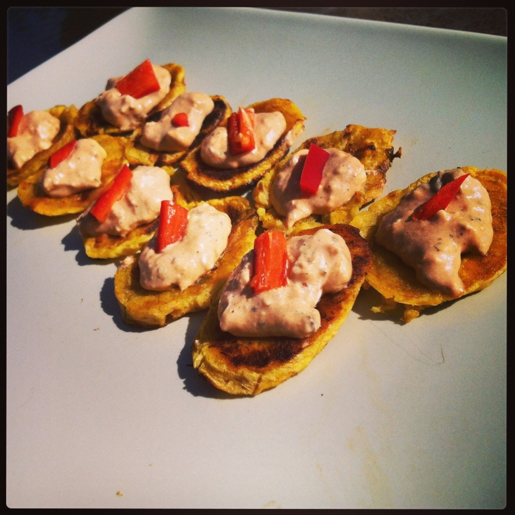 I love plantains and wanted an easy healthy appetizer, so I came up with this. I used my homemade Chipotle Sauce, which can be substituted for any hot or chile pepper sauce.