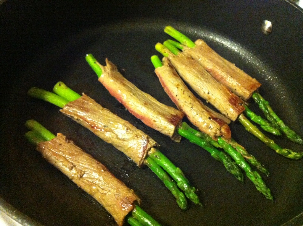 Wrap thin slices of meat around the Asparagus spears. Sometimes it’s best to use two stalks if they are skinny. try not to wrap it too much, so that the meat gets cooked throughout.