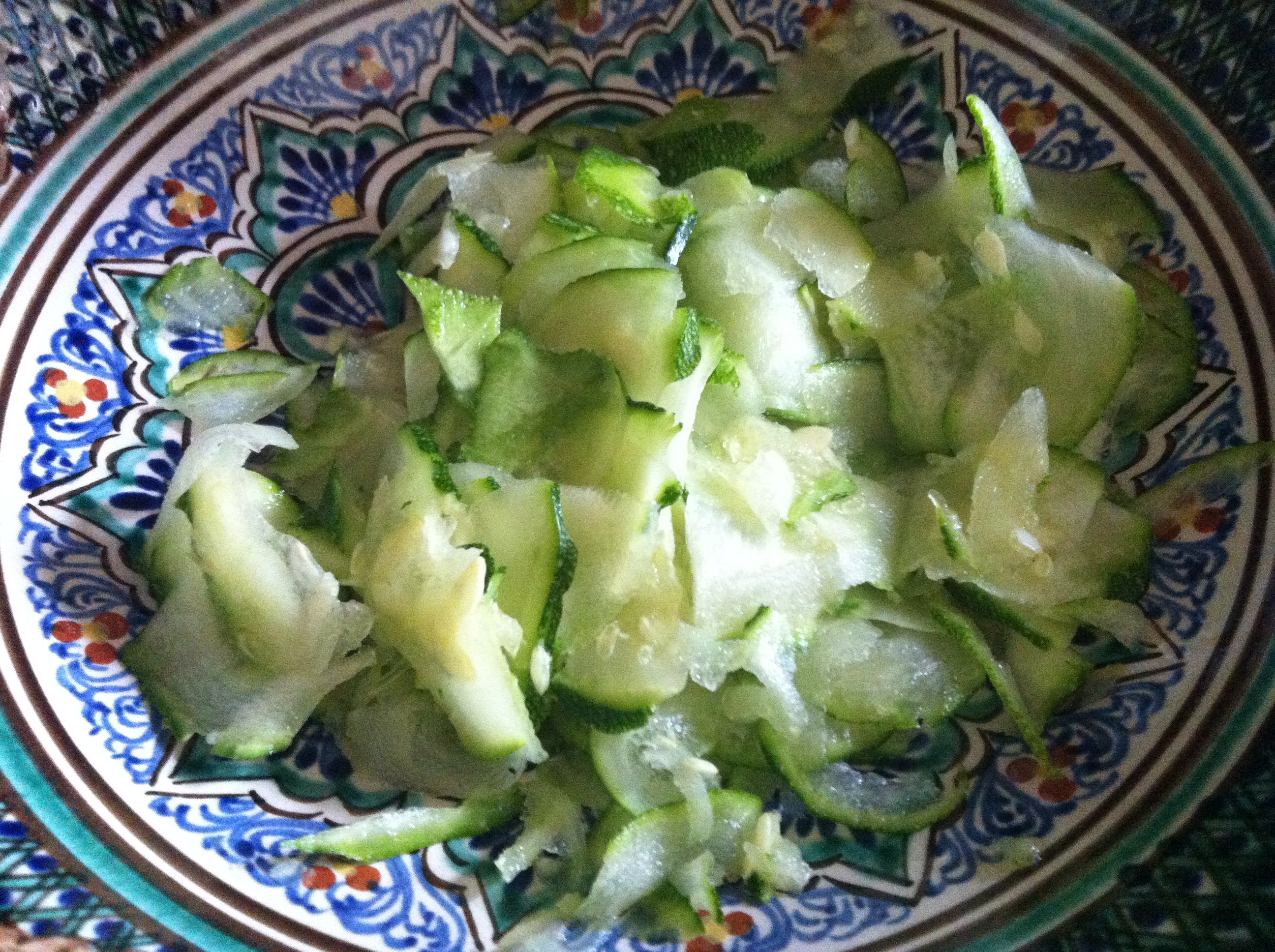 - On the bottom of the baking dish, I layered a thin layer of zucchini. I did not pre-cook the zucchini this time.