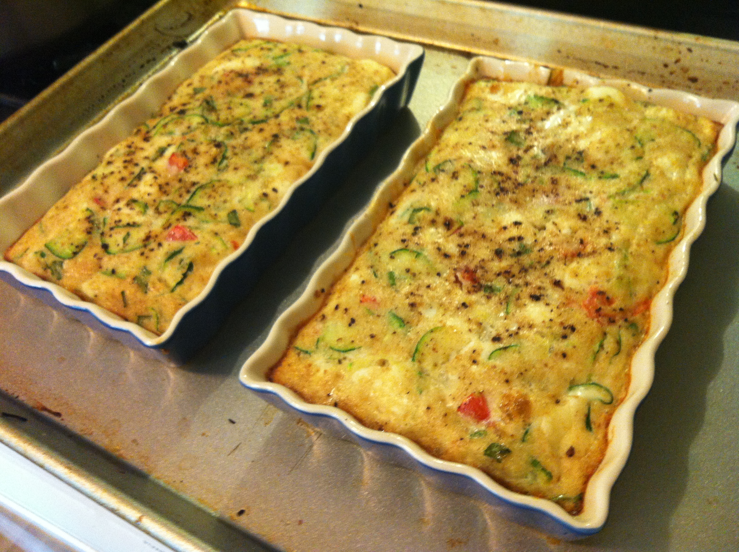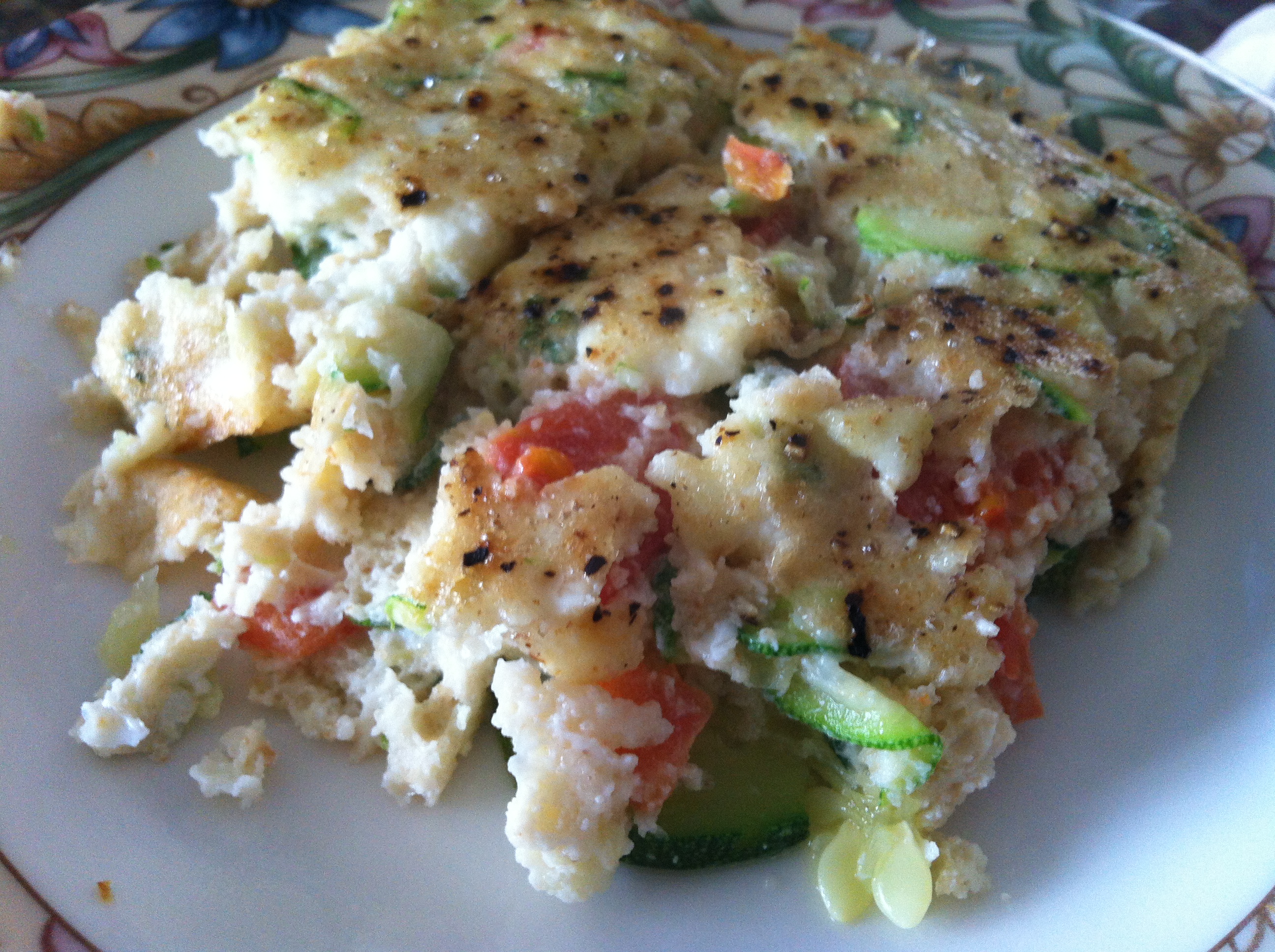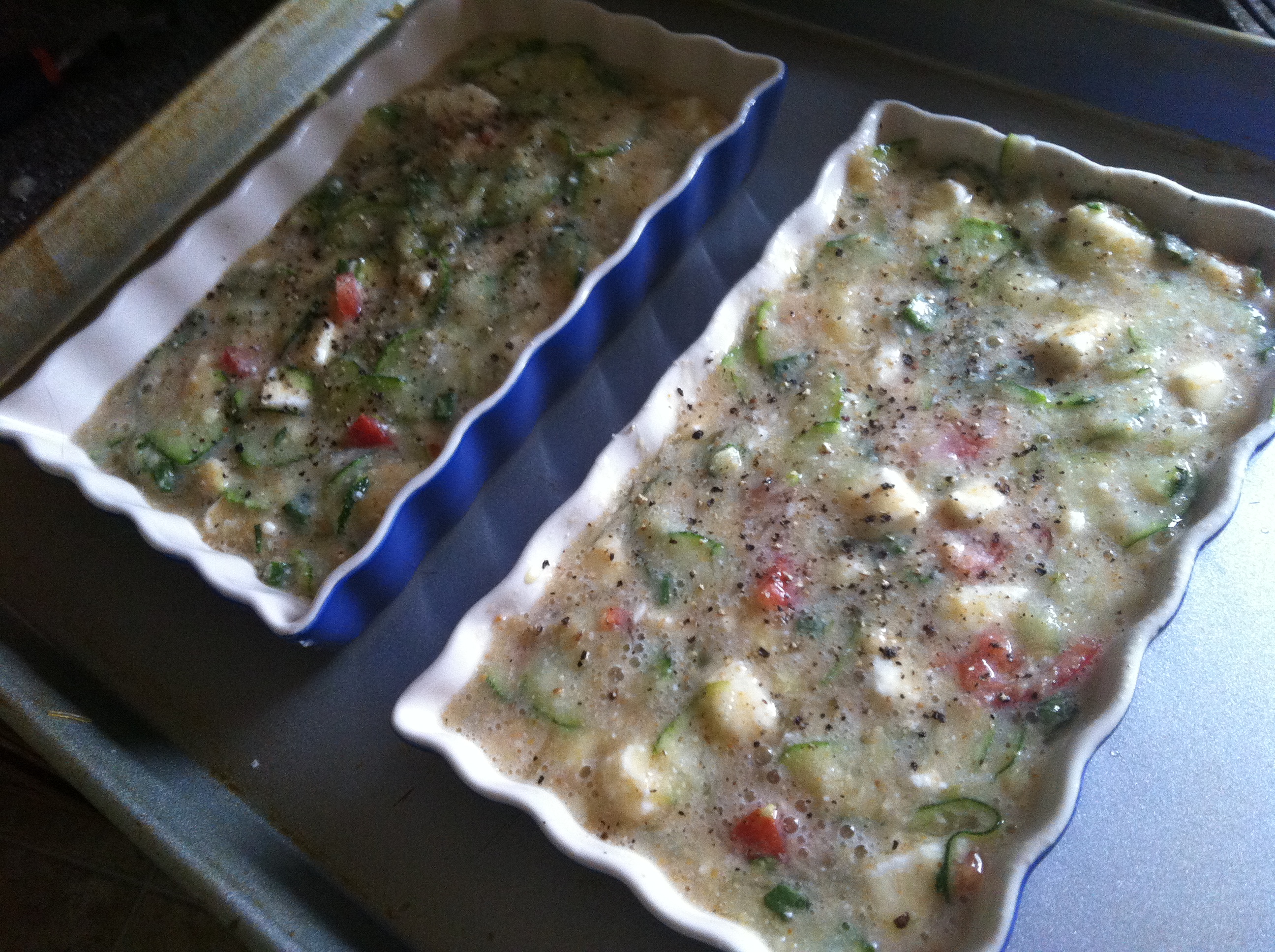 - I grated the other zucchini in a medium sized bowl. Added the chopped onion, roma tomato, olive oil, cheese and egg whites.