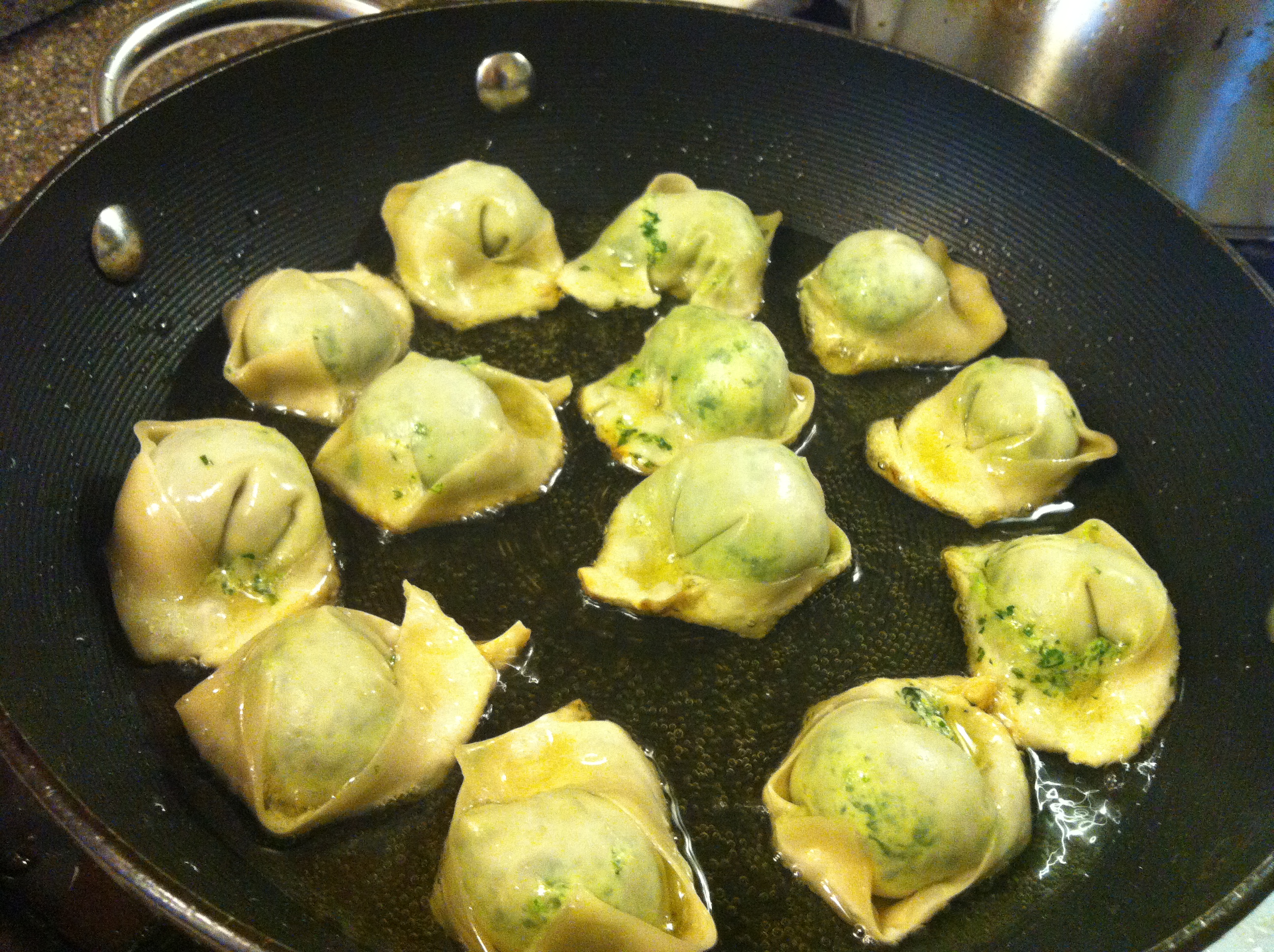 - Add 2-3 tbsp of oil to the pan and on medium heat, fry the wontons until crispy on both sides. I do one side for 4 minutes and then the other for about the same. Trying not to flip too much, but keep an eye on them.