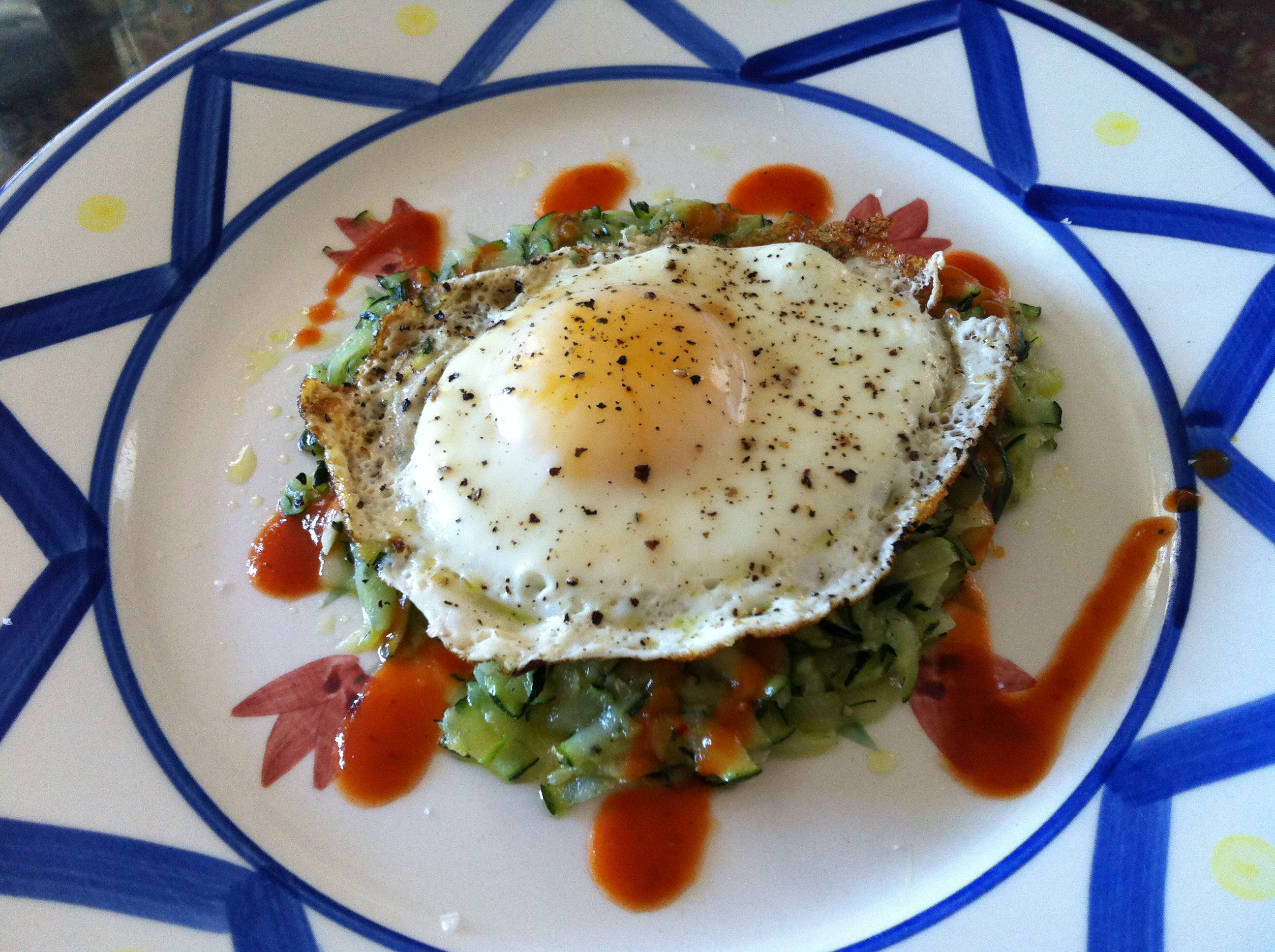 - Sautee the zucchini until cooked throughout and plate. Add you hot sauces and top with a fried egg.