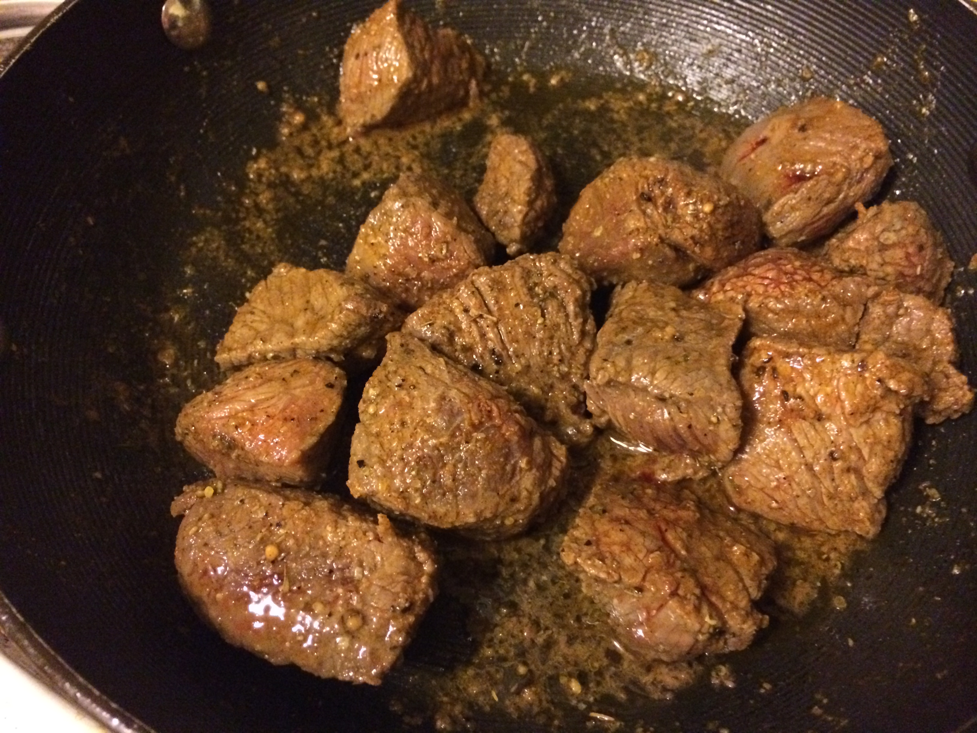 - Wash and pat dry beef cubes, add dry rub and toss in a bowl until coated. Add to pan with the olive oil (unless you use bacon grease) on medium heat, cook on all sides until browned. Remove from pan and set aside.