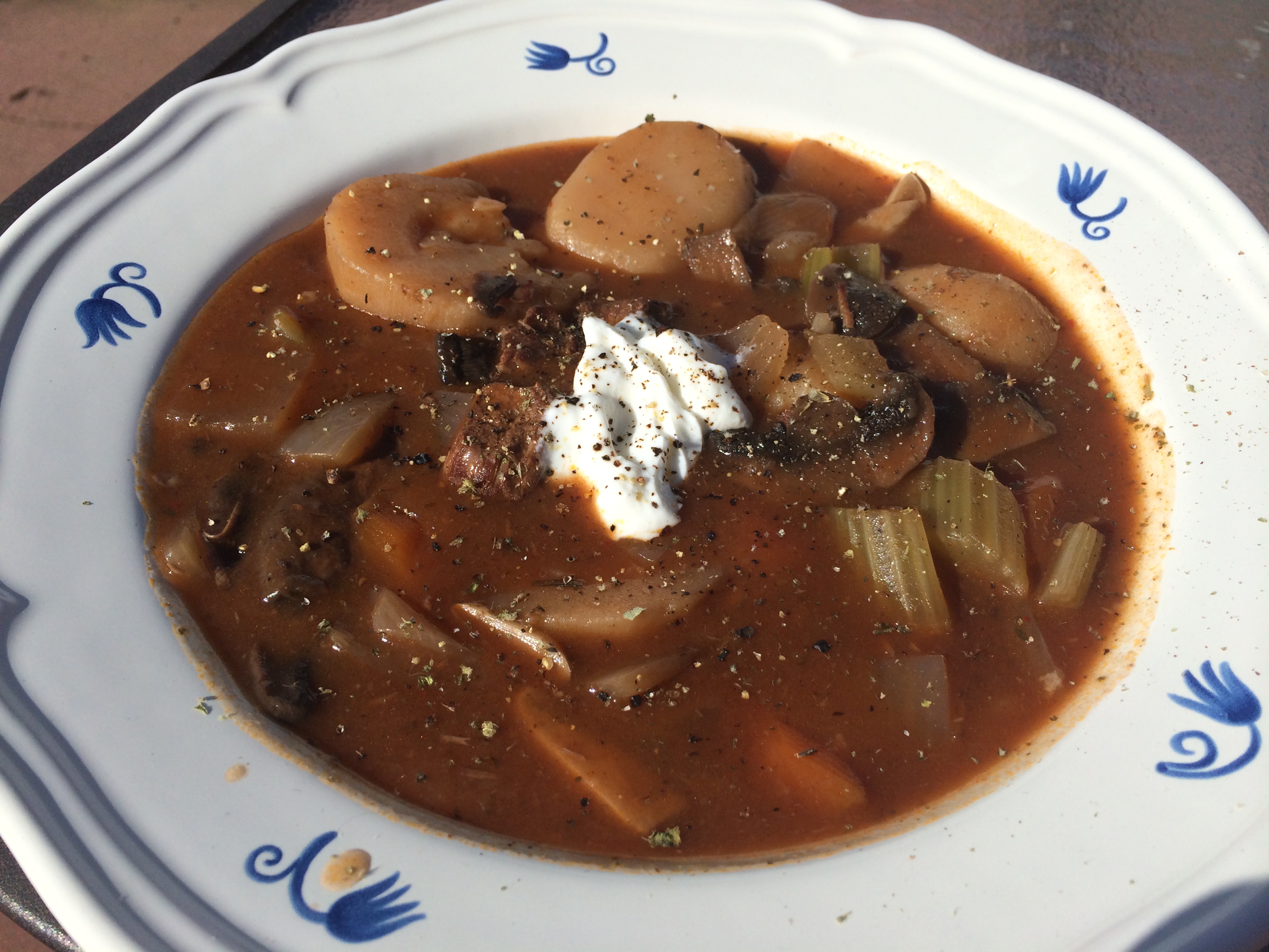 I used the formal recipe for Beef Bourginion, but made some adjustments and omitted the bacon to be a little leaner, add celery and I made my own vegetable stock to use instead of beef broth.