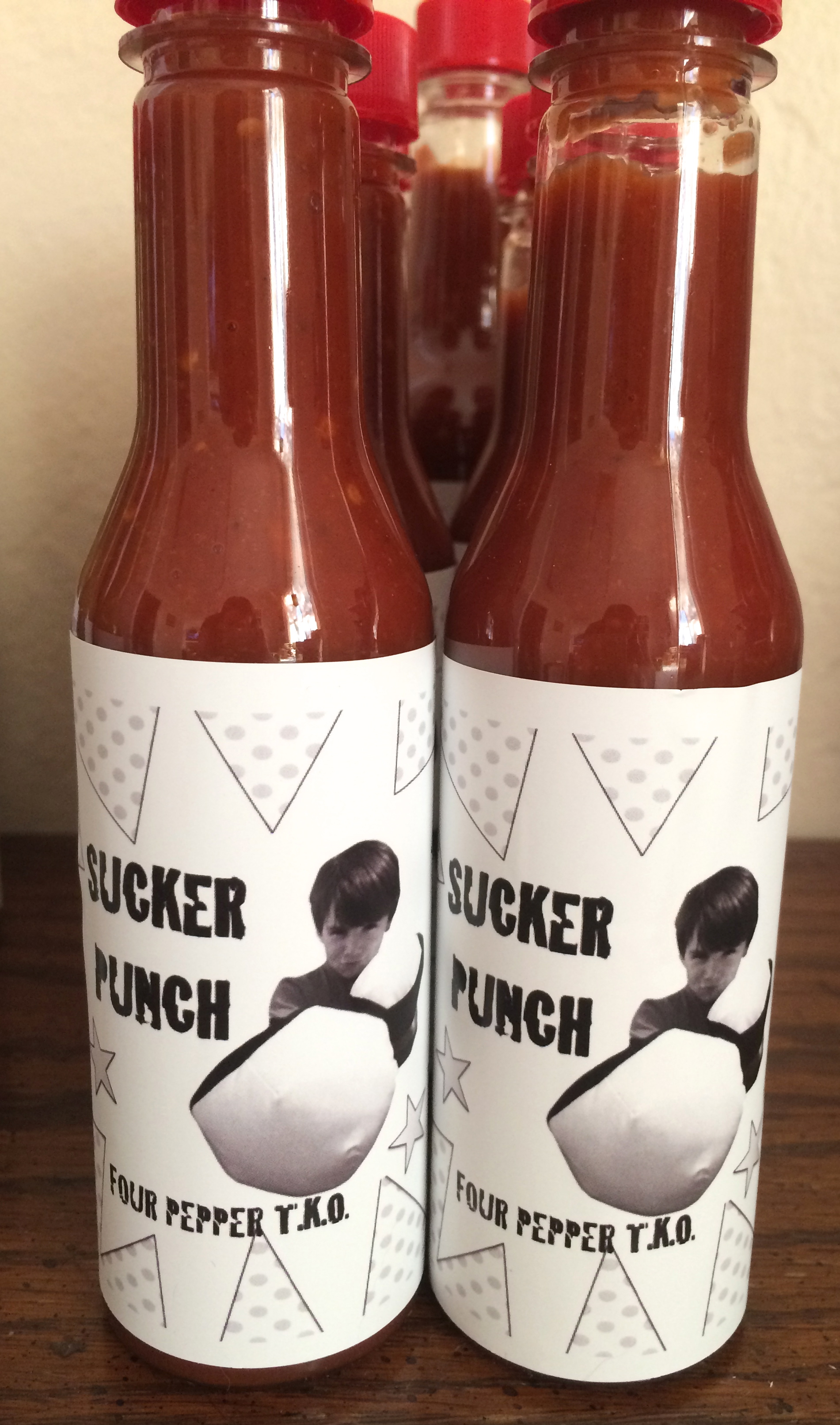 Sucker Punch is my newest hot sauce and is made from four types of peppers including Habaneros, Chile Pequin, Chile Tepin (Birds Eye Chiles) and Cayenne Pepper. It has a really nice heat that hits you like a SUCKER PUNCH.